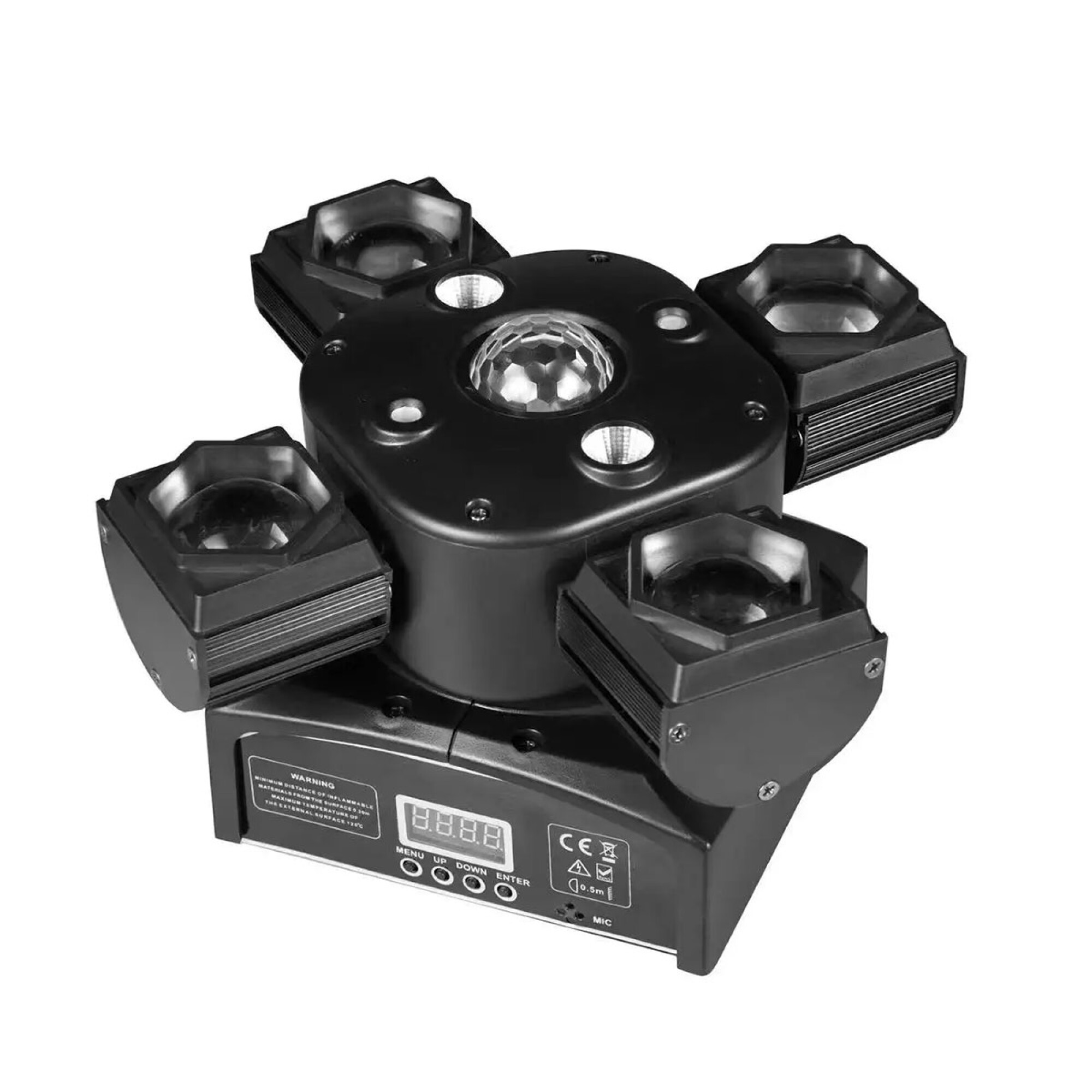 Sistema de iluminación versátil con efectos combinados de LED, estrobo, bola LED y láser, ideal para espectáculos dinámicos.