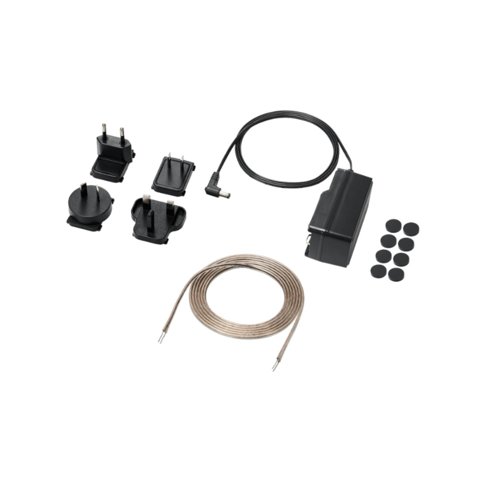 Accesorios: Adaptador de CA + 4 adaptadores de enchufe, cable de parlante, 8 patas de goma