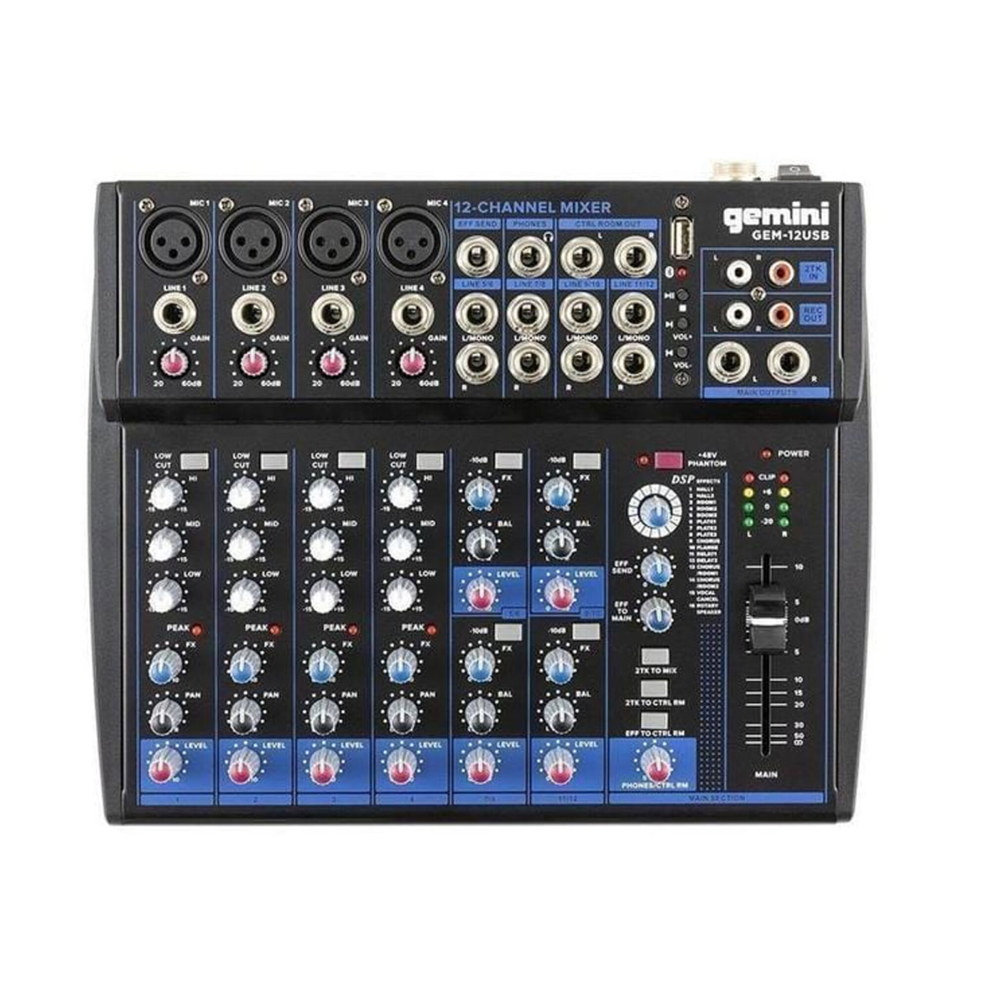El Gemini GEM12USBE es un mezclador diseñado para facilitar el podcasting. Este mezclador se creó para fusionar una interfaz fácil de usar con un sonido de primera calidad. Equipado con transmisión Bluetooth, reproducción USB, sonido personalizable y un mezclador de 12 entradas y 12 buses. El GEM12USBE ofrece grabaciones de calidad profesional de última generación sobre la marcha.