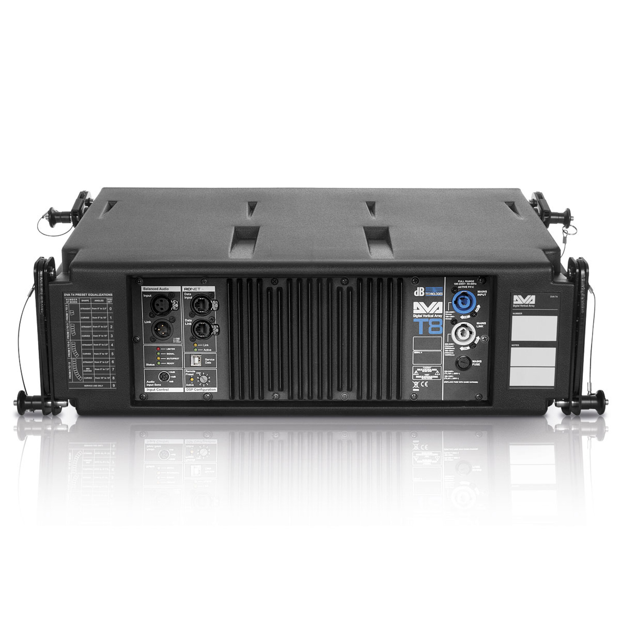El DVA T8 es un módulo activo de tres vías equipado con woofer de neodimio de 8” bass réflex, 1 medio de 6,5” bobina 2, con trompeta y dotado de corrector de fase, y 2 drivers de 1” con trompeta de directividad constante. Todo ello optimizado para garantizar una cobertura uniforme de 100° x 15° para cada módulo.El amplificador digital Clase D con tecnología Digipro G2 tiene una potencia de 700 W RMS. Cada módulo puede alcanzar una presión sonora de 132 dB. La alta eficiencia de los amplificadores de Clase D permite la conexión de hasta 8 módulos en una única línea 16 amperios y 220 V.