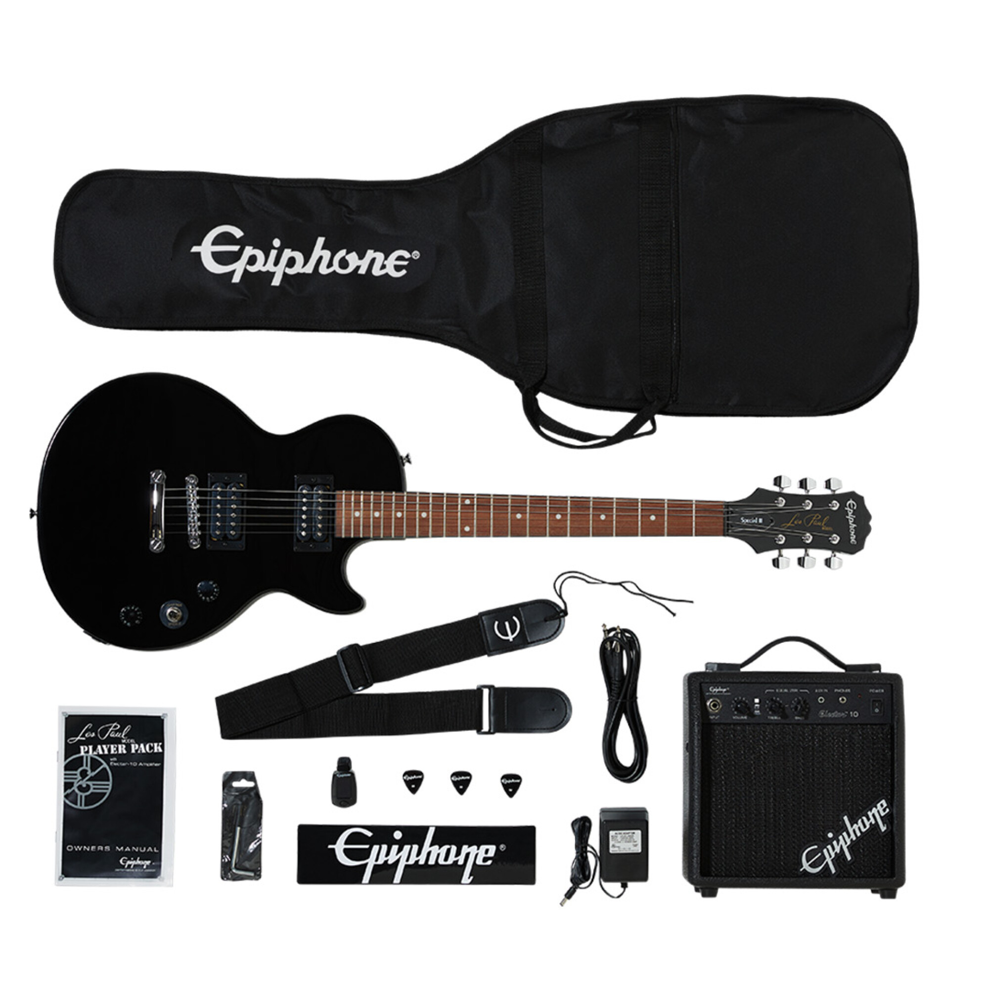 El Pack Les Paul Player de Epiphone tiene todo lo que necesitas para empezar a tocar la guitarra de inmediato, incluida una guitarra Les Paul Special-II LE genuina con dos pastillas humbucker clásicas y un amplificador de guitarra Electar de 10 vatios con un cable de guitarra de 10 pies. Epiphone también incluye un afinador cromático de clavijero con clip, una correa de guitarra, púas medianas y una funda fácil de llevar. Y lo mejor de todo para los nuevos jugadores, el Les Paul Player Pack viene con lecciones de guitarra descargables gratuitas de eMedia ™ que cubren rock, blues, folk, country, hard rock y metal.